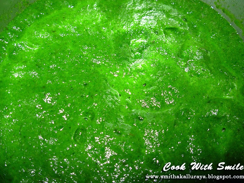 - Grind spinach and green chilli to a fine paste . While grinding add little lemon juice ,this will help in retaining the green color. Open the mixer jar and keep , else the color will change.