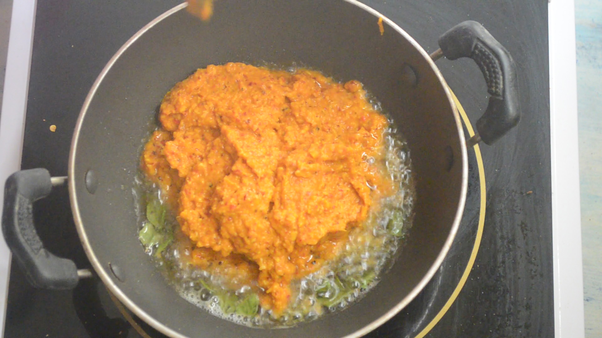 - Transfer the fried masala,tamarind and salt to a mixer/blender. Grind to a paste. Add cooked carrots. Blend smooth but don't make super smooth. Taste test.
