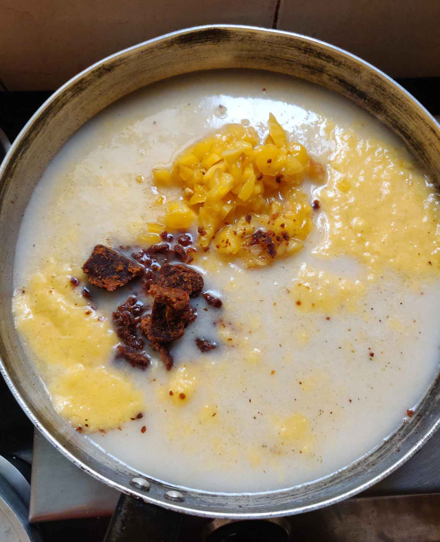 - In a pan take jackfruit puree, finely chopped jackfruit pieces, jaggery and thin coconut milk. Remember not to add thick coconut milk at this stage .. it might curdle.
