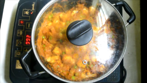 - Add blended tomato onion masala and mix well . Saute for 1 min and cover and cook the masala for 2-3 mins stirring in between on a low flame
